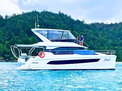 Aquila 44.3 – ‘Pearl’ In this 2022 build, 3 cabin layout featuring a saloon and galley with 360 degree views and an extensive flybridge make entertaining a breeze. An alfresco dinette from the galley to the aft deck has a partition the lifts up to create a service bar, perfect for morning coffee’s or sunset cocktails. Each cabin has its own ensuite allowing for maximum privacy when on board. With a beach wood interior, air-conditioning, central galley with Corian countertops, electric fridge and freezer, Nespresso coffee machine and water maker, the Aquila 44 design means longer cruising ability. The covered flybridge with additional dining area, sun bed on either side of the helm and easy access to the bow with the stairway from the bridge, makes navigating this vessel a delight.