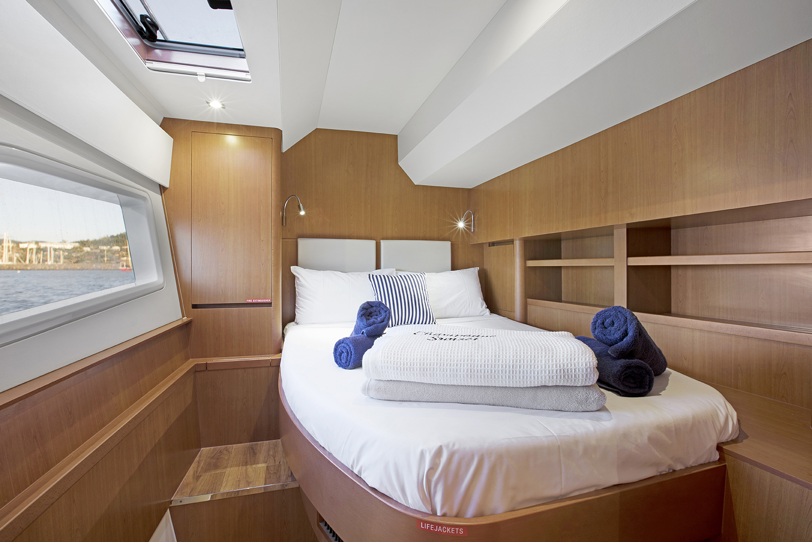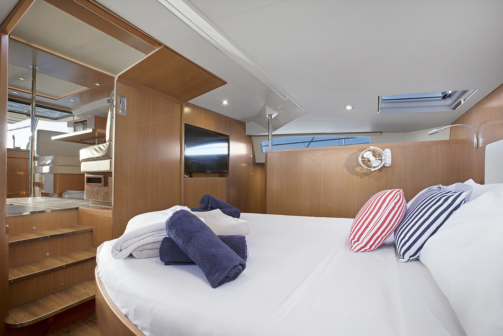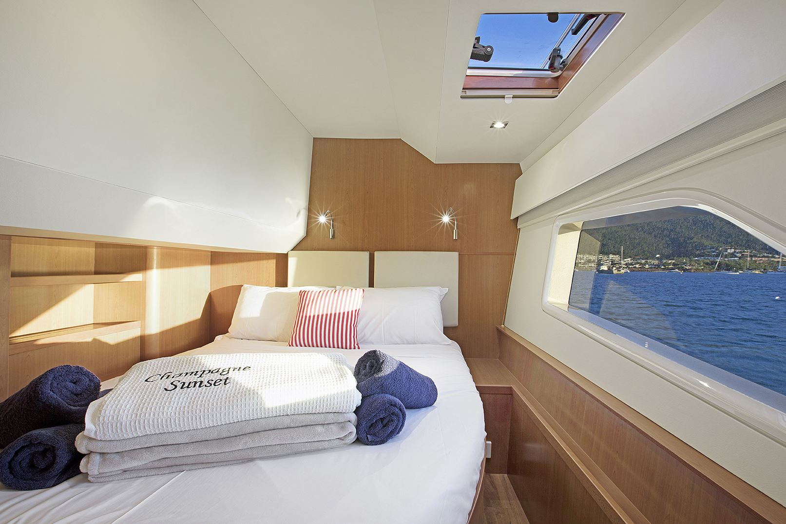 The Aquila 44 offers a unique holiday experience in the Whitsundays. Enjoy 360˚ views from the spacious saloon and galley that features a large seating area, hidden TV stowage and plenty of storage to make a live-aboard or cruising easy and pleasant.