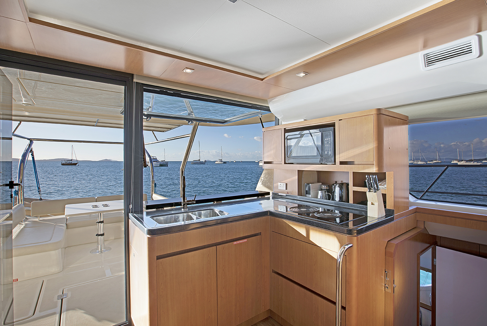With a cherry wood interior, galley features including Corian countertops, electric fridge and freezer, stove, Nespresso coffee machine and stainless steel microwave oven as well as a double stainless steel sink.