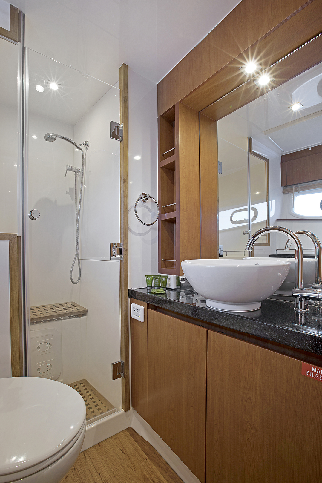 The large staterooms each feature ample headroom and large windows for excellent views. A fresh water flush, separate shower stall and teak flooring compliment the boat's design and exceptional living comforts.